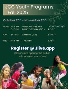 The JCC is excited to introduce our Fall 2025 Programming, beginning October 20 and ending on November 20! For 5 weeks, children and adults can enjoy a variety of Monday-Thursday programming in the afternoons and evenings. Explore art, dancing, sports, and more in this amazing lineup of programs.