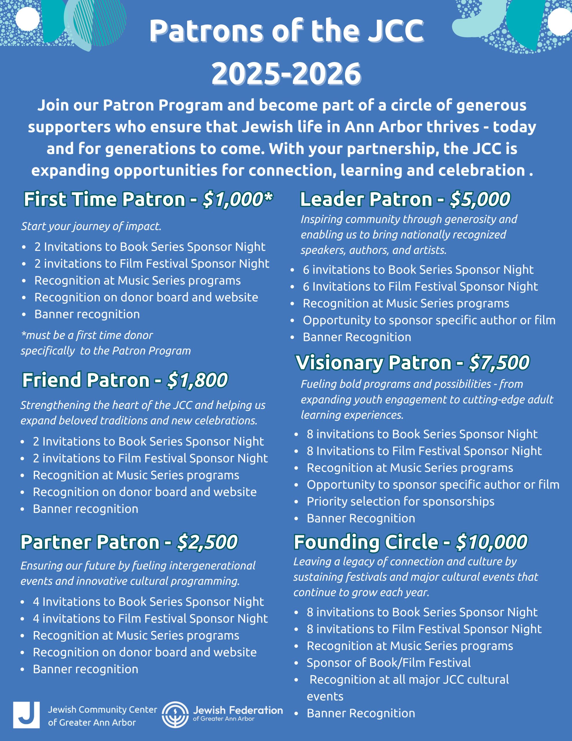 Patrons of the JCC are community members who are passionate about sustaining meaningful programs and experiences at the Jewish Community Center of Greater Ann Arbor. Your support helps bring books, film, music, cultural arts, and other enriching programming to our community.